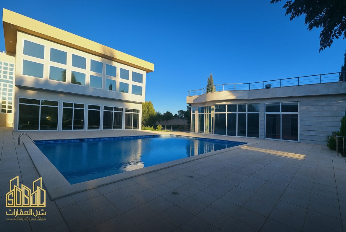 مسبح خارجي : 12 × 8 متر وعمق 1.4 متر الي 2.05 متر مع منطقة جلوس حول المسبح